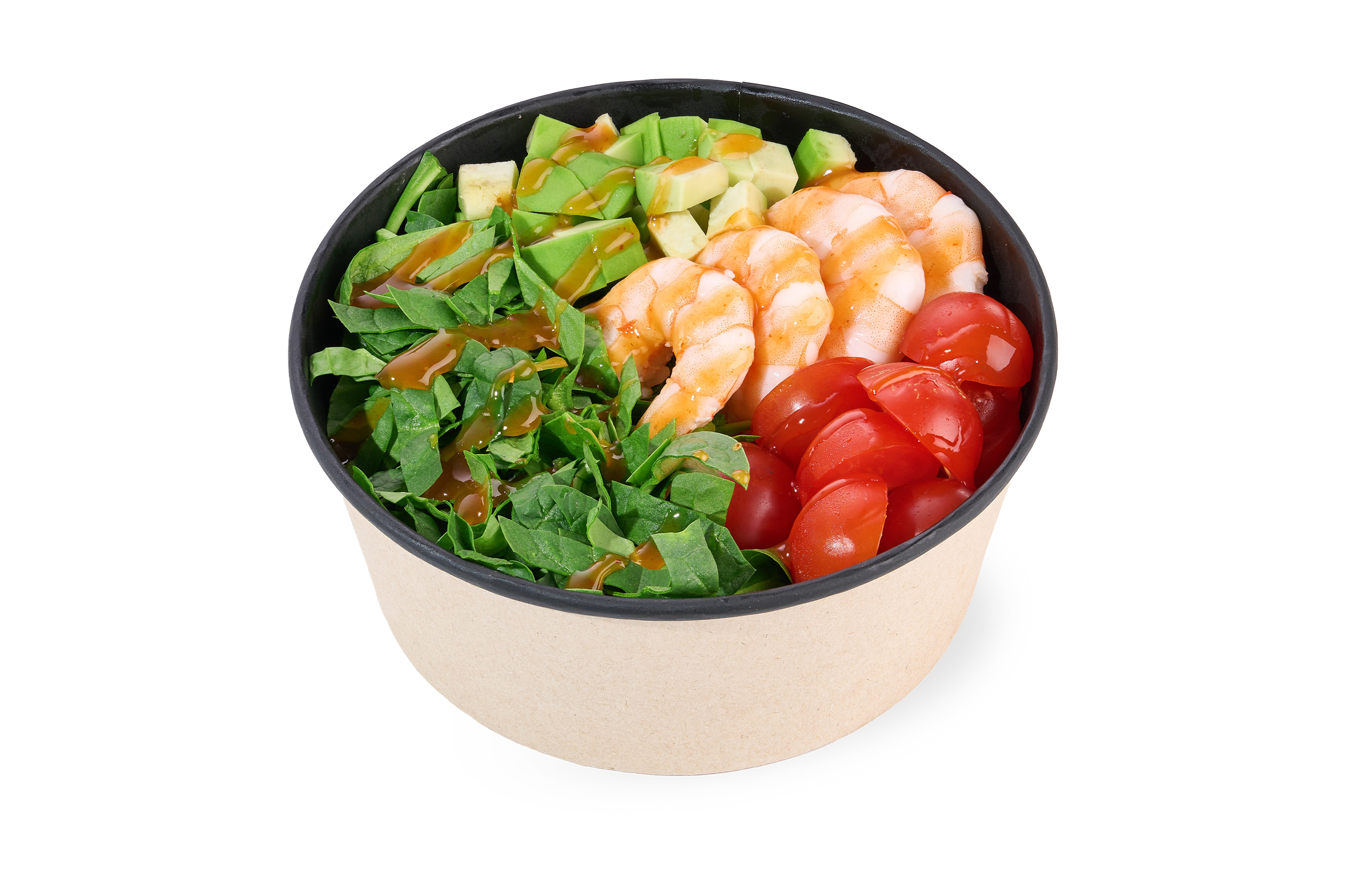 350г · Рис, креветка, авокадо, помидоры черри, шпинат, том ям соус, манго-чили соус