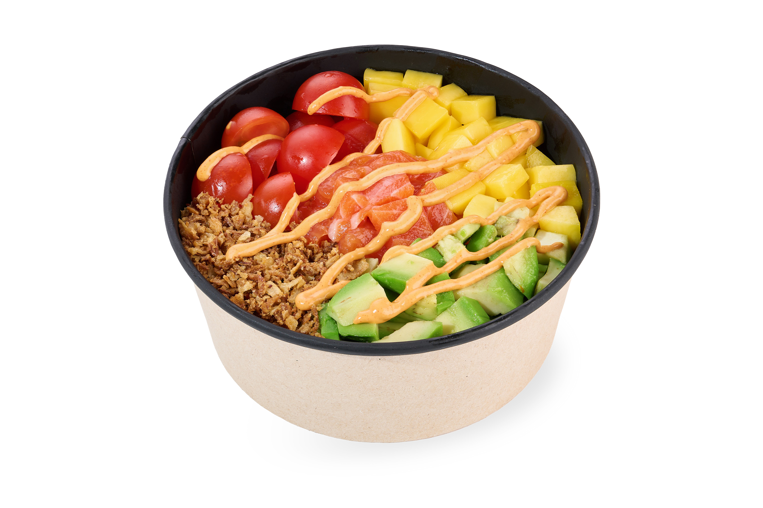 390г · Рис, лосось, авокадо, лук фри, помидоры черри, манго, понзу соус, спайси соус