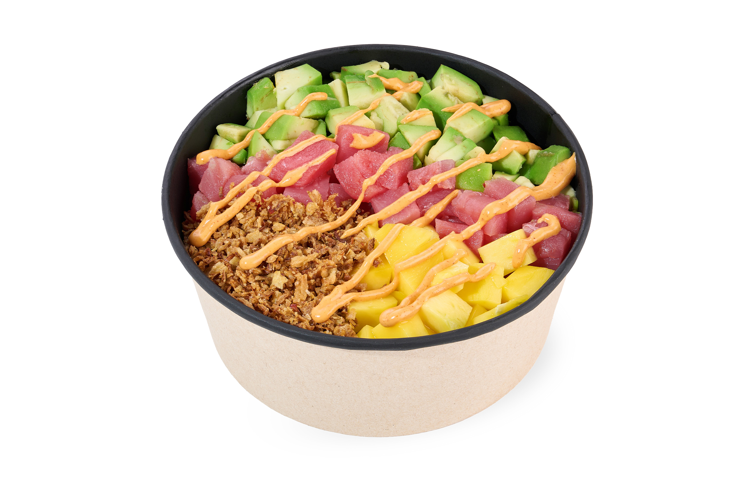 340г · Рис, тунец, авокадо, лук фри, манго, понзу соус, спайси соус