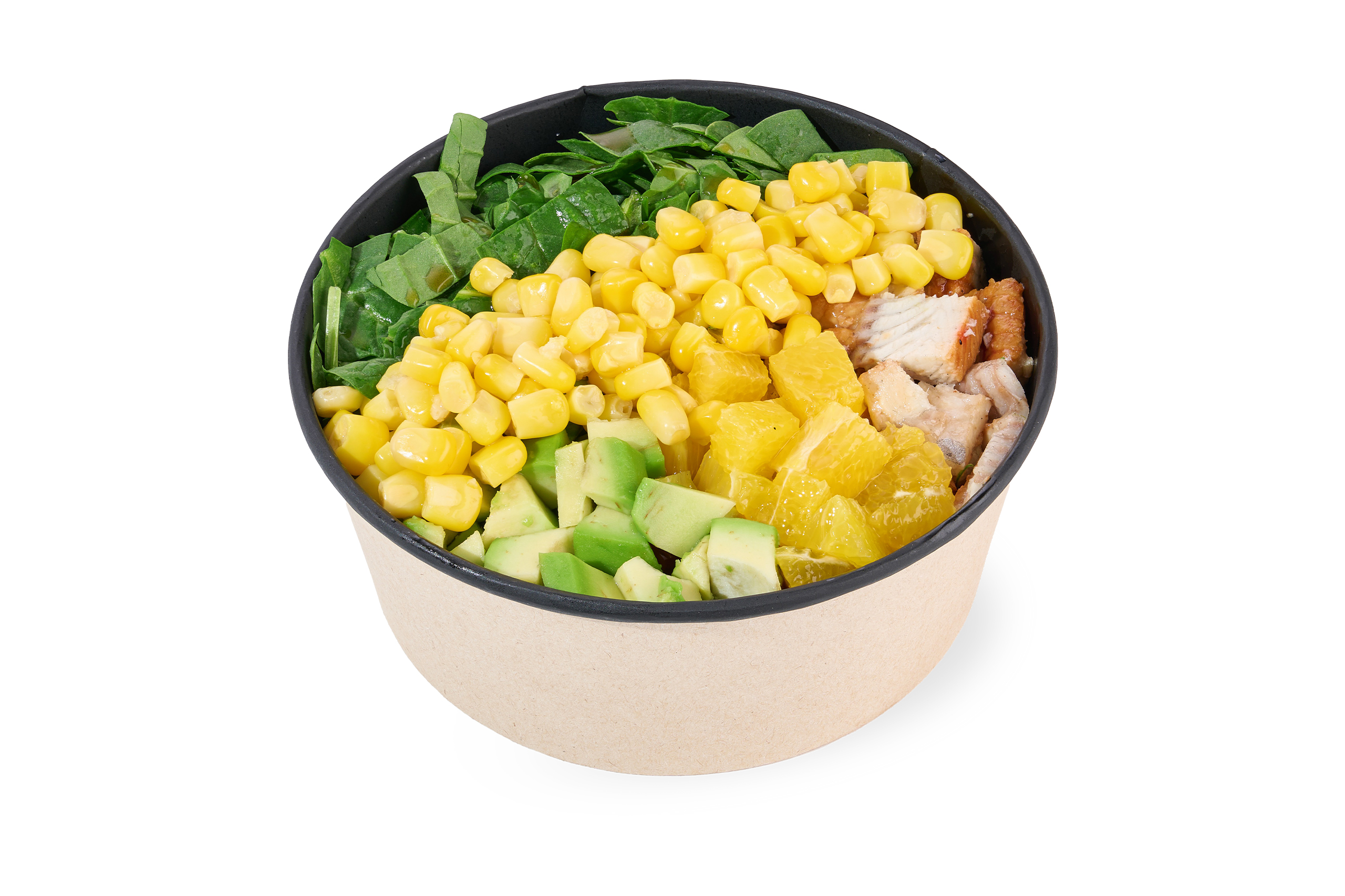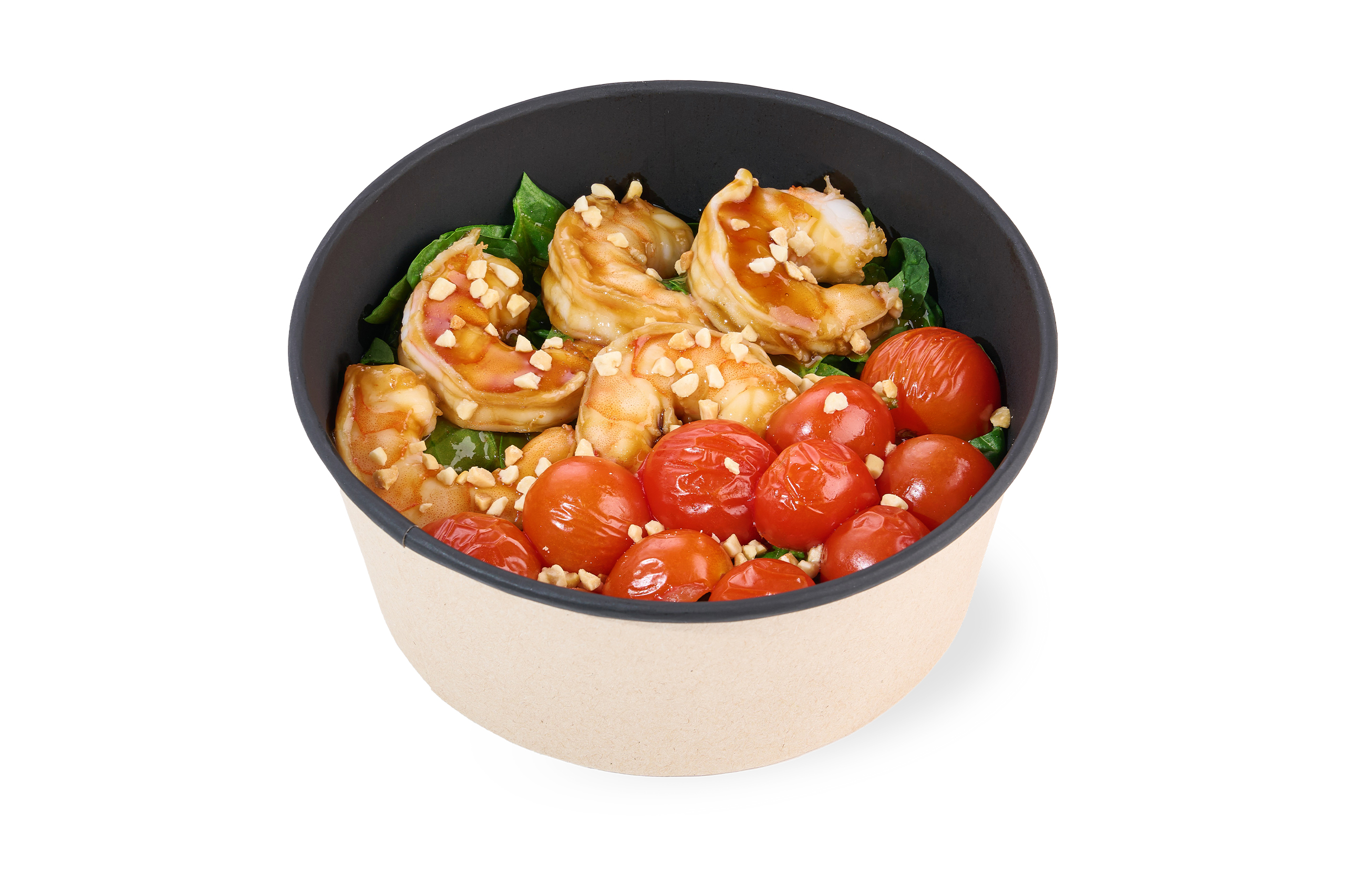180г · Шпинат, помидоры черри, арахис, креветка, манго-чили соус, понзу соус