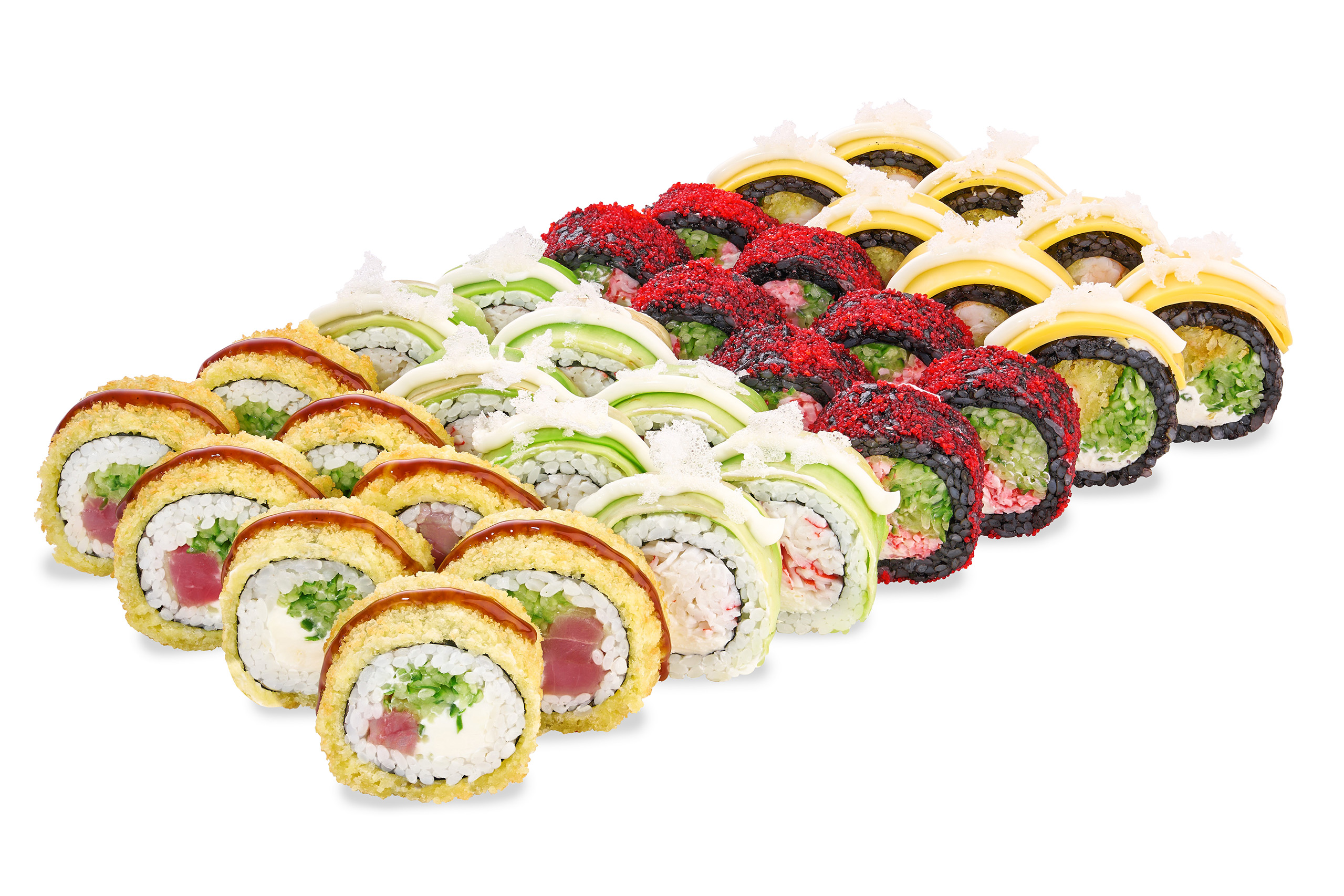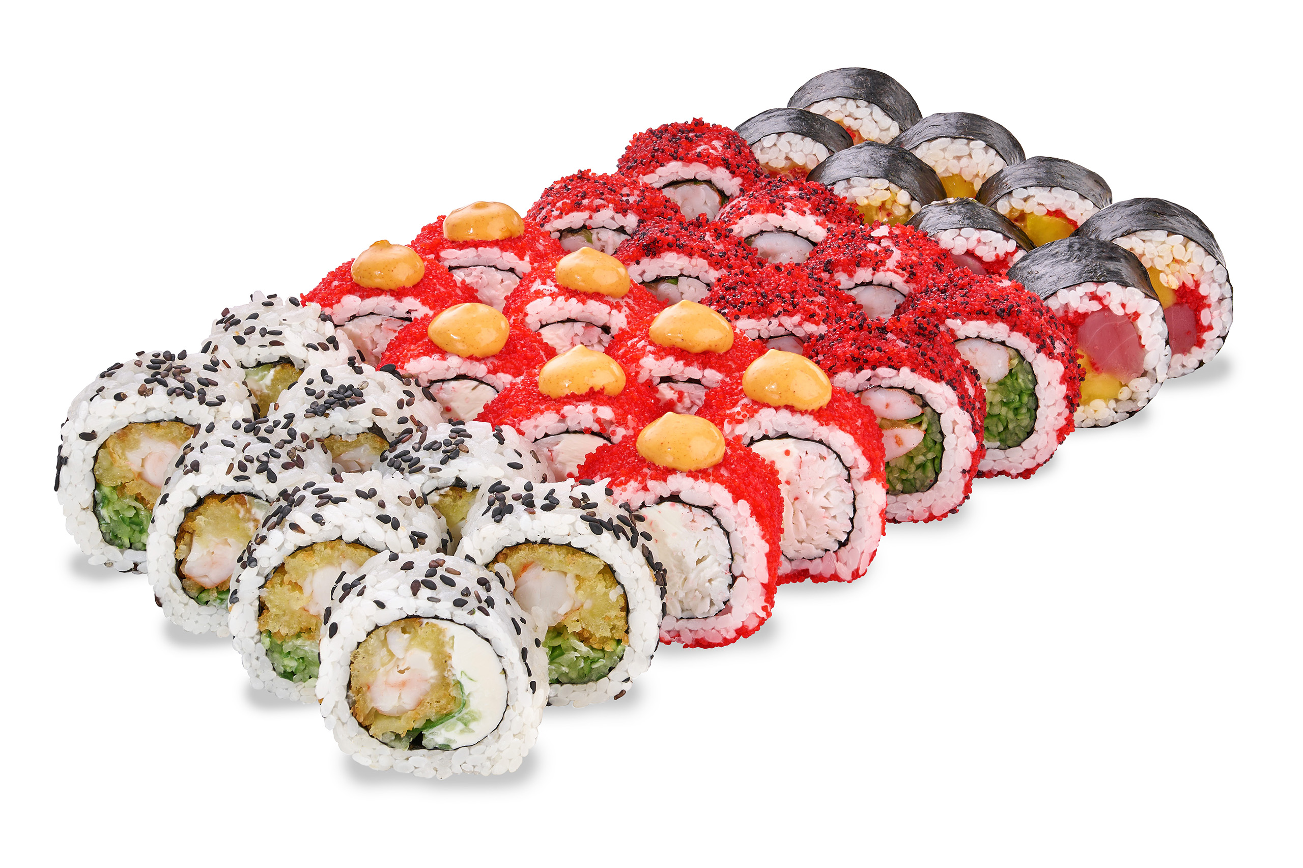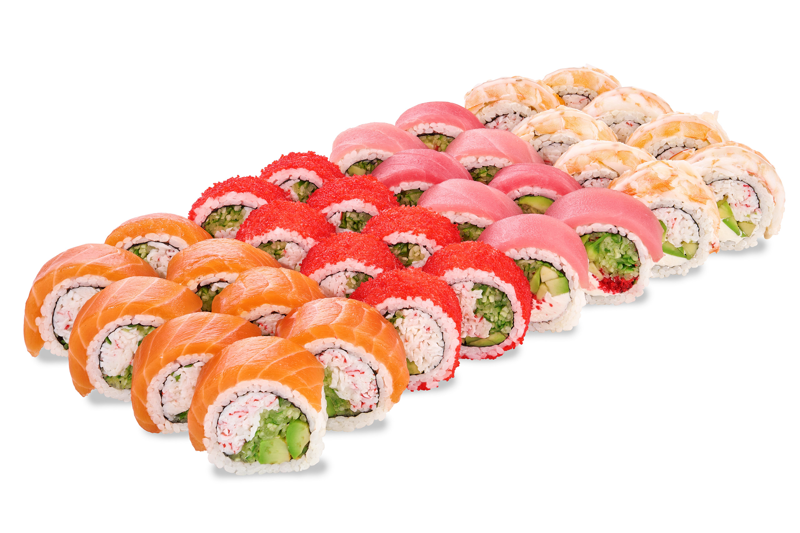 240г · Рис, нори, лосось, тунец, креветка, икра масаго, огурец, сыр сливочный