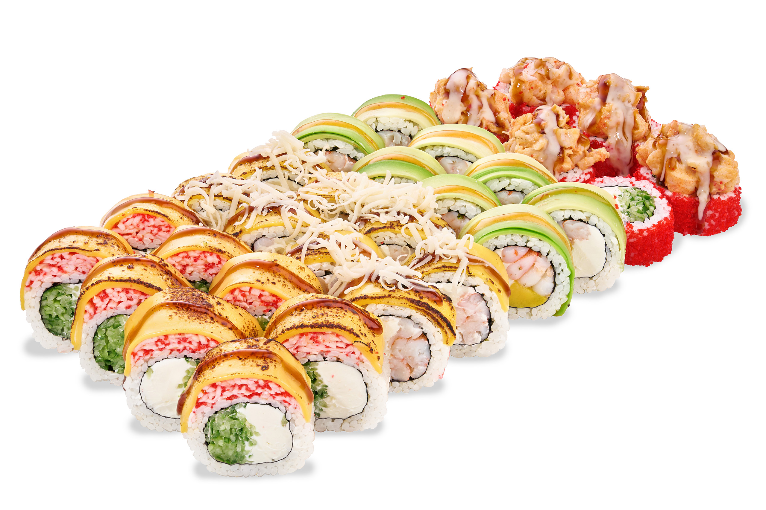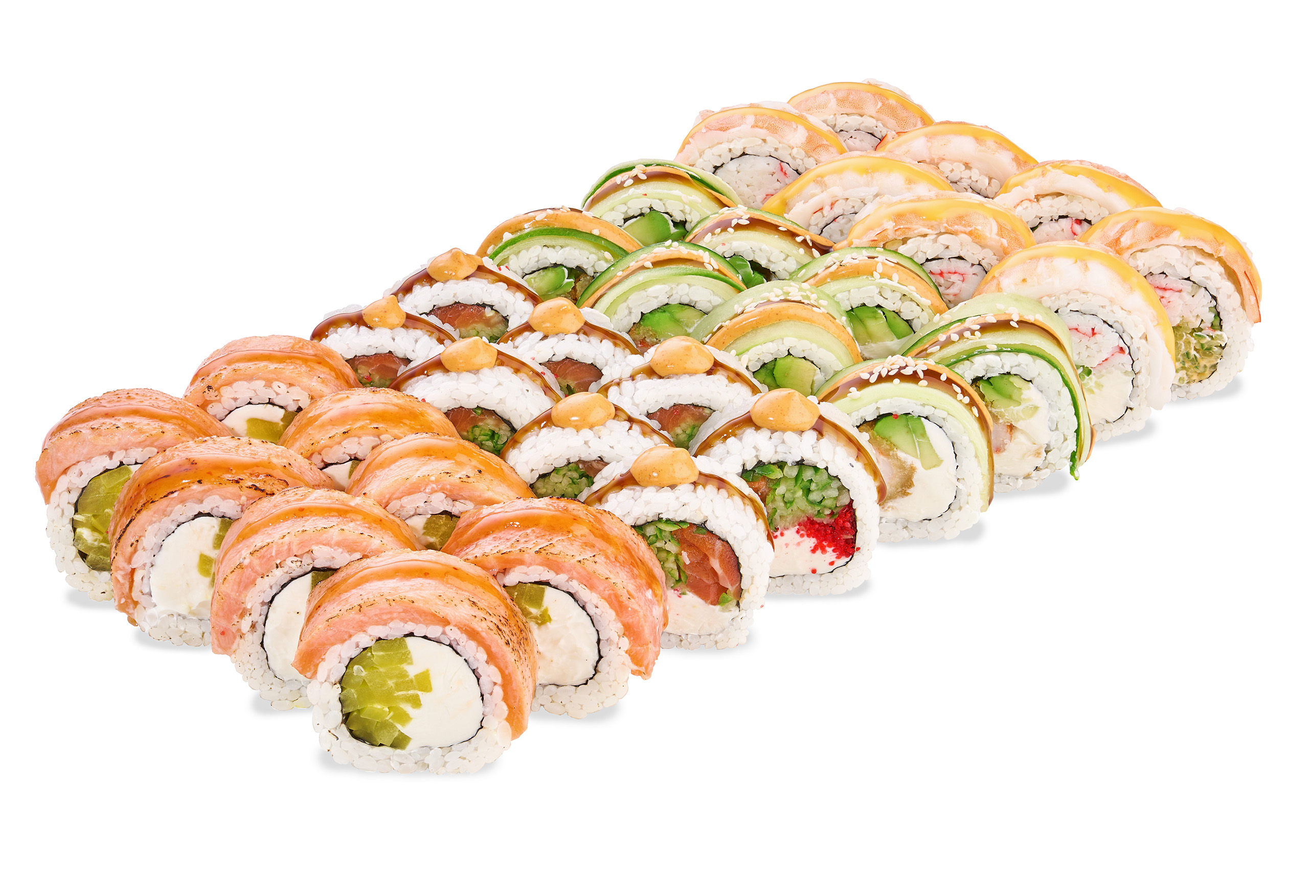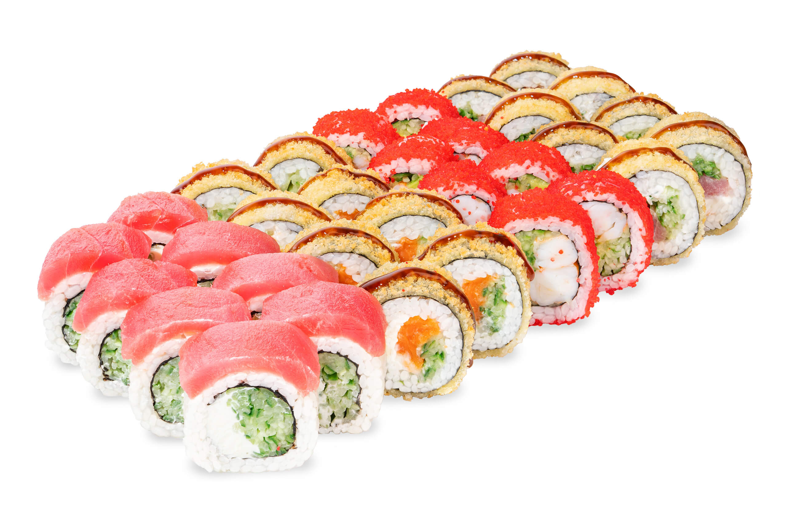 240г · Рис, нори, лосось, тунец, креветка, икра масаго, огурец, сыр сливочный