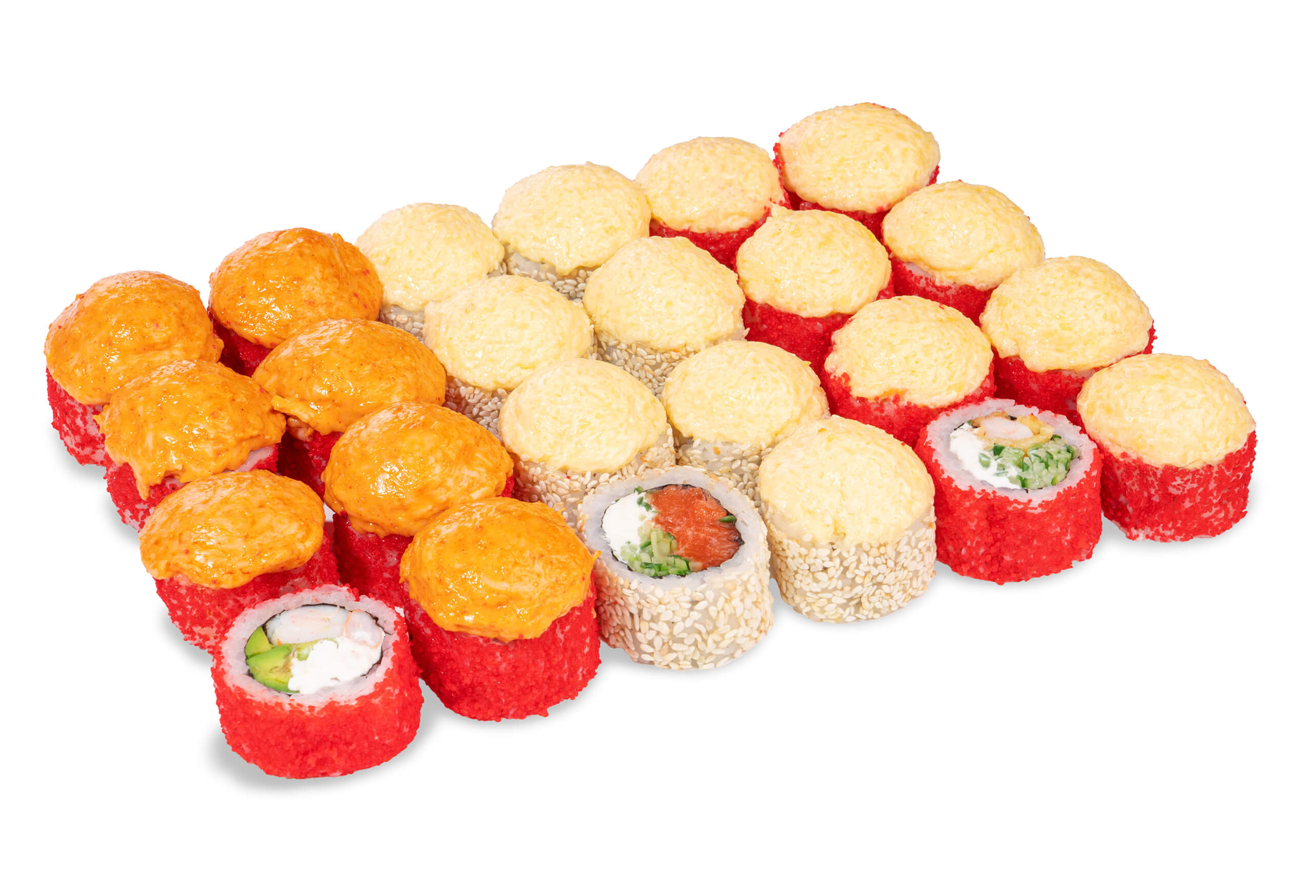 370г · Рис, нори, творожный сыр, лосось, огурец, крабовый замес, авокадо, шрирача, красная икра масаго, чесночно-сырная шапка