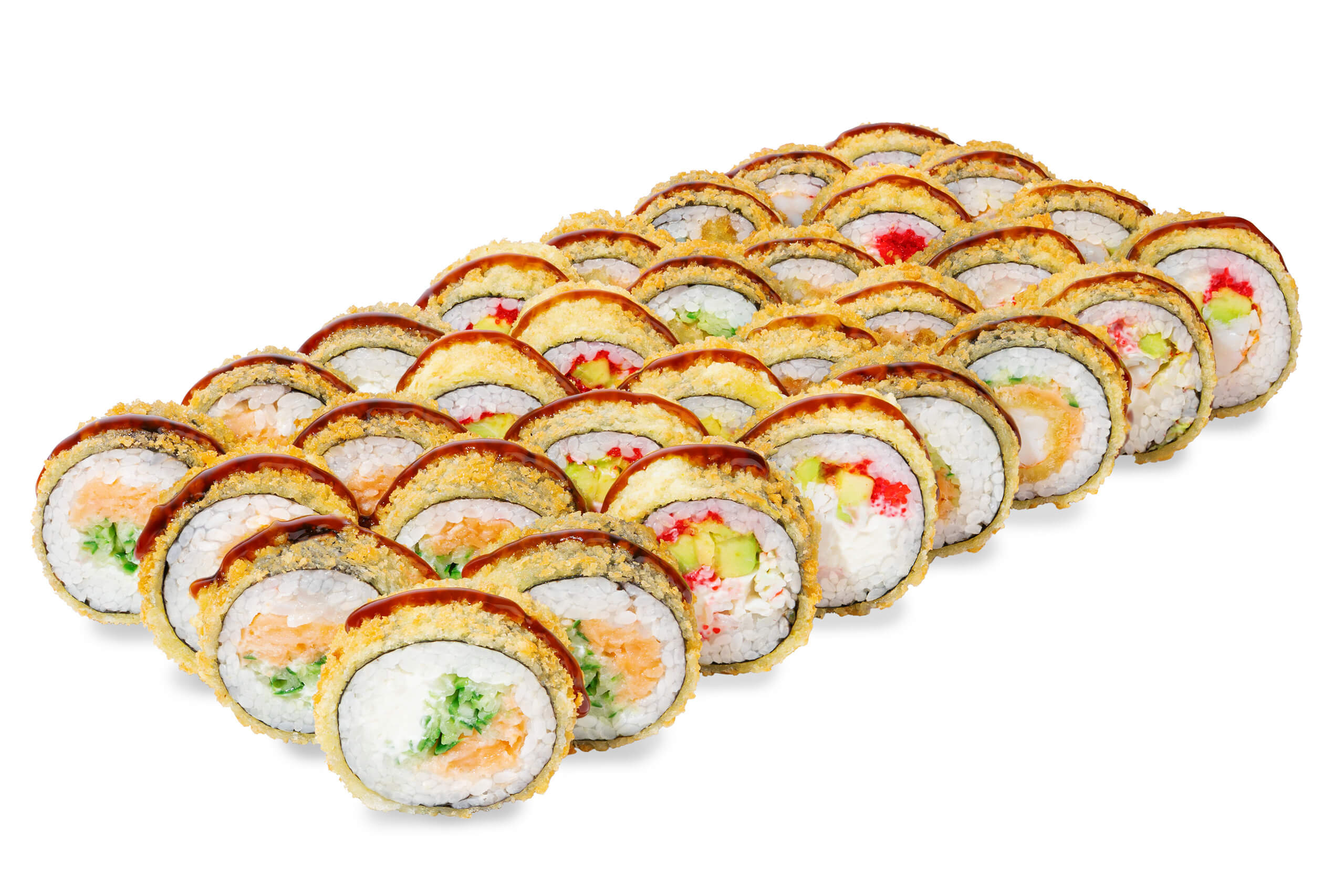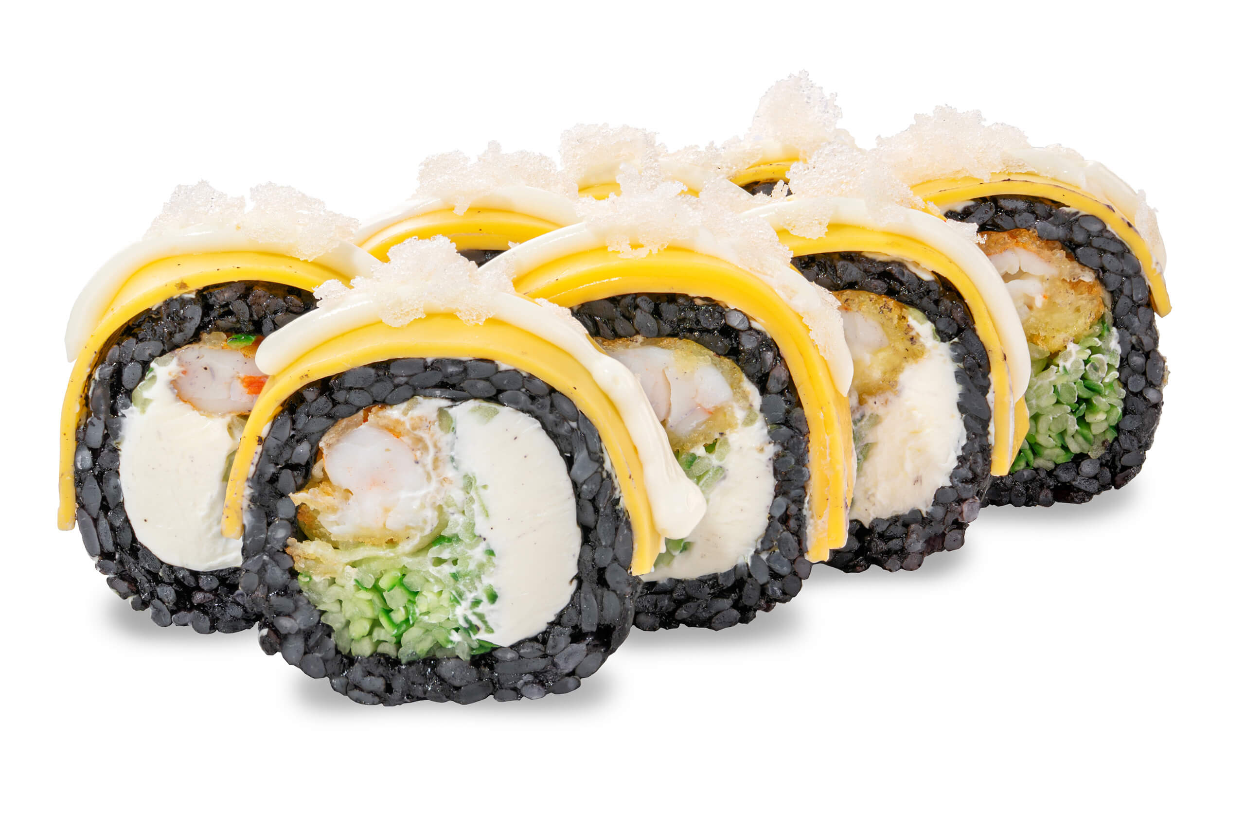 265г · Рис, нори, творожный сыр, огурец, креветка темпура, сыр Чеддер, фирменный соус, рис фри