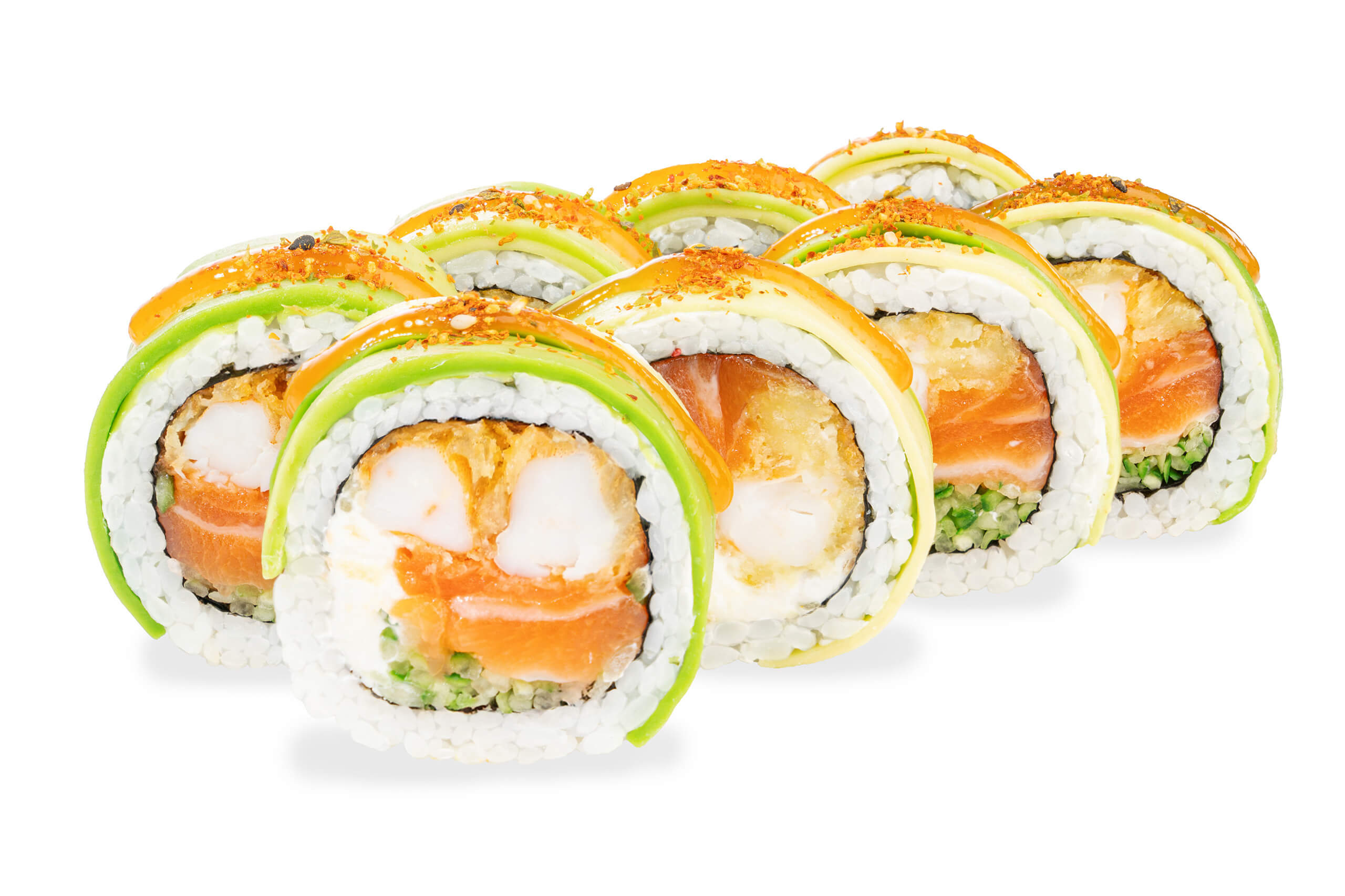300г · Рис, нори, творожный сыр, огурец, лосось, креветка темпура, авокадо, соус манго-чили, кунжут, шичими