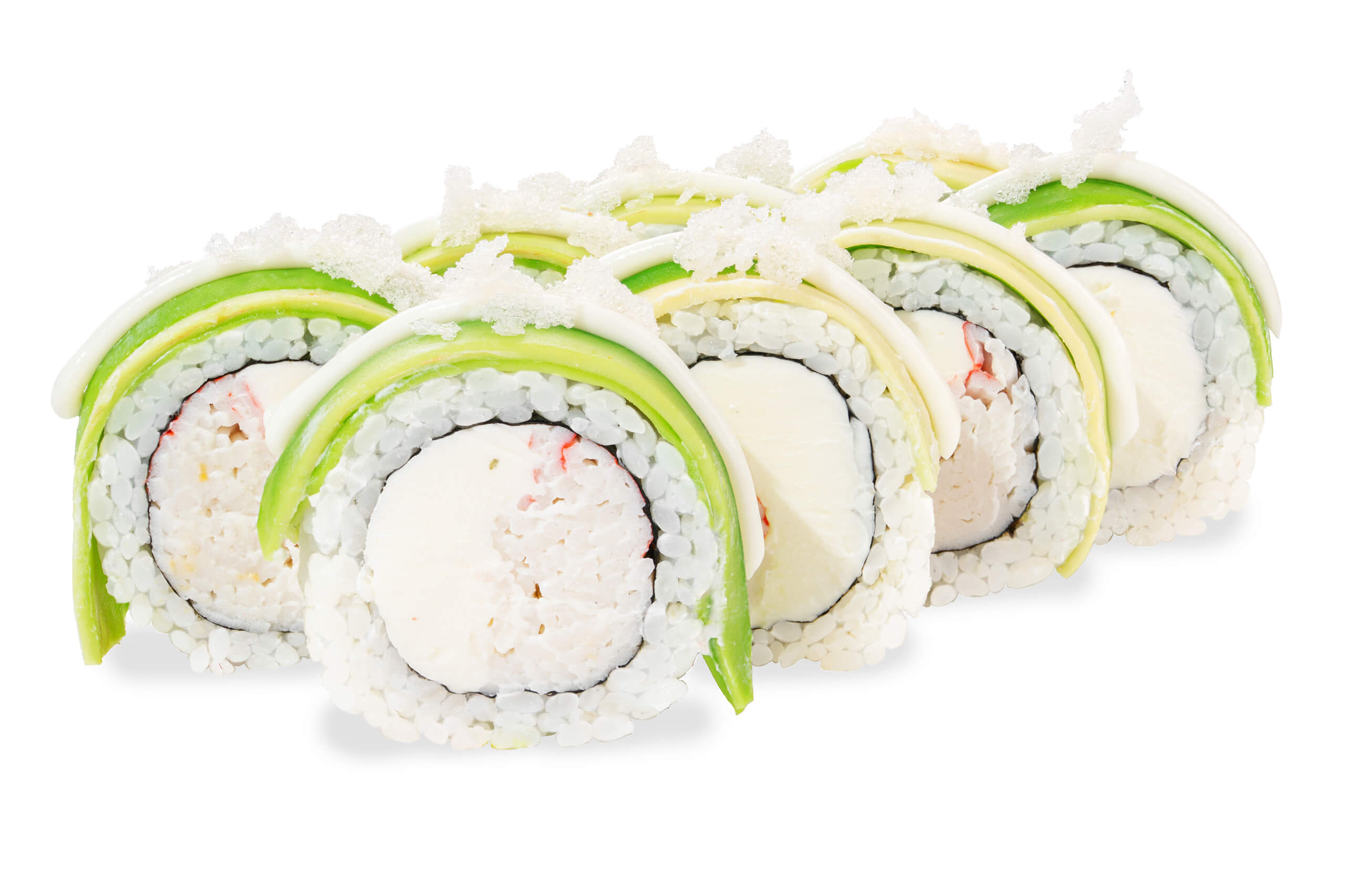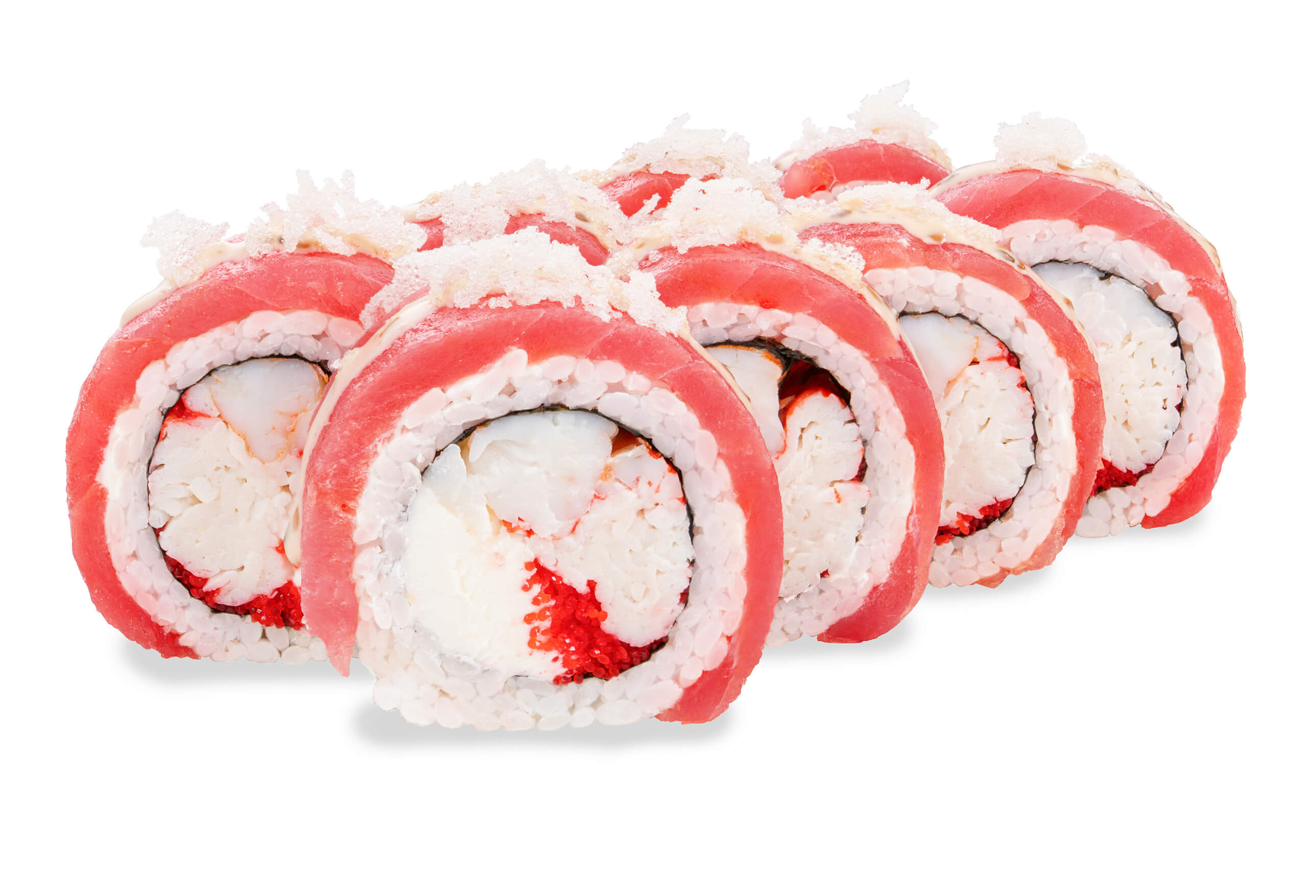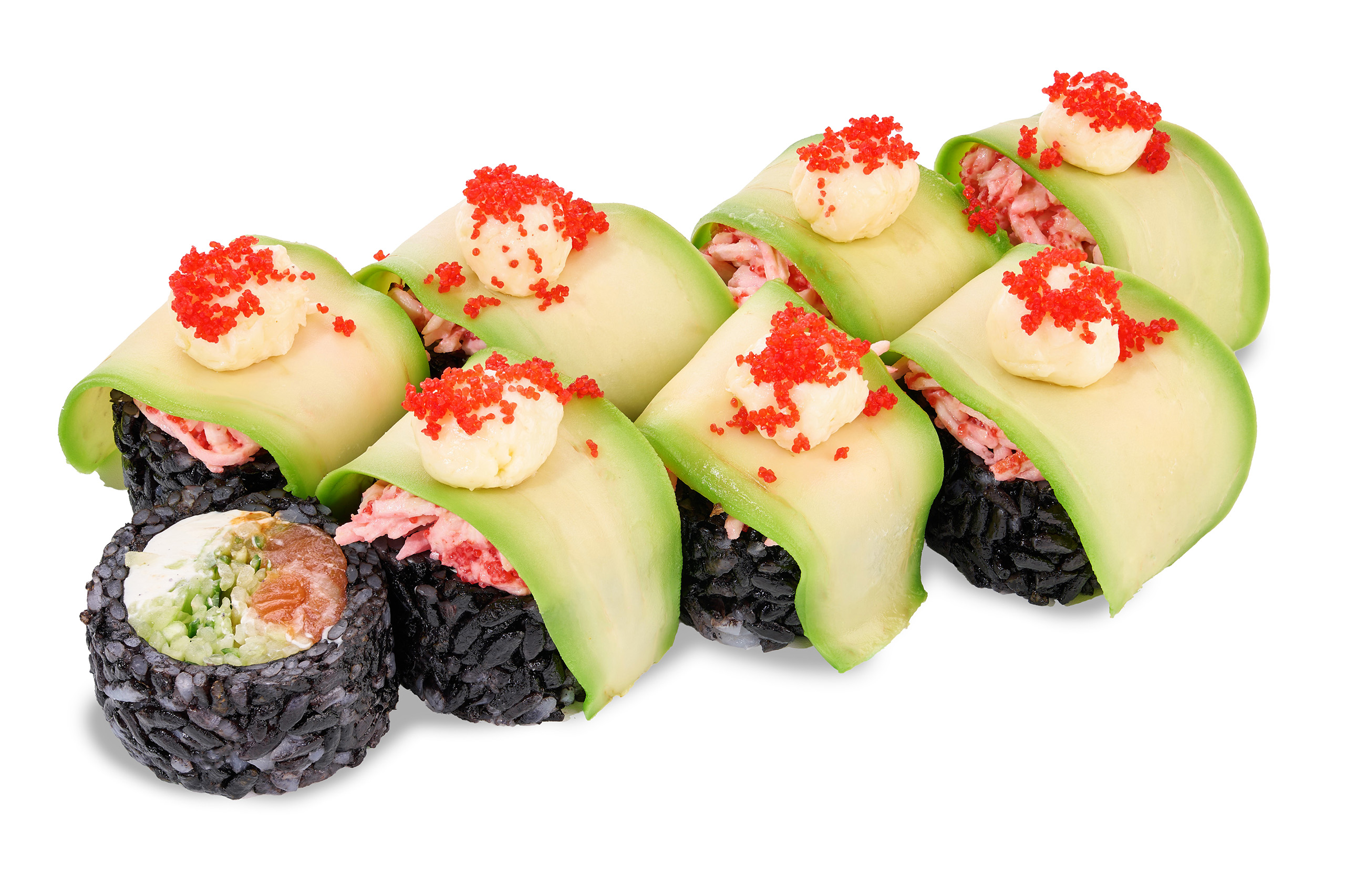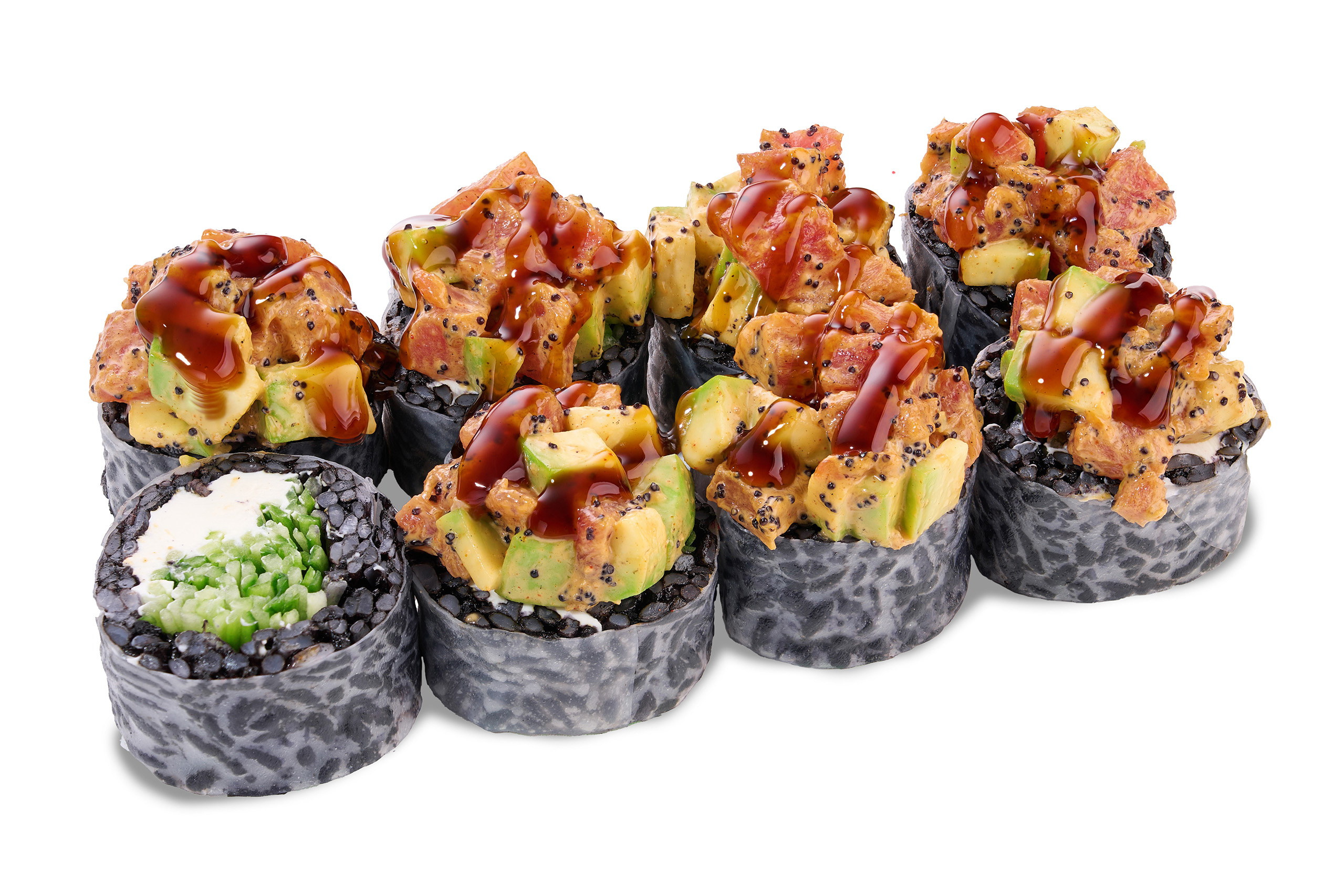 320г · Рис, рисовая бумага, творожный сыр, огурец, авокадо, тунец, икра масаго, спайси соус, унаги соус