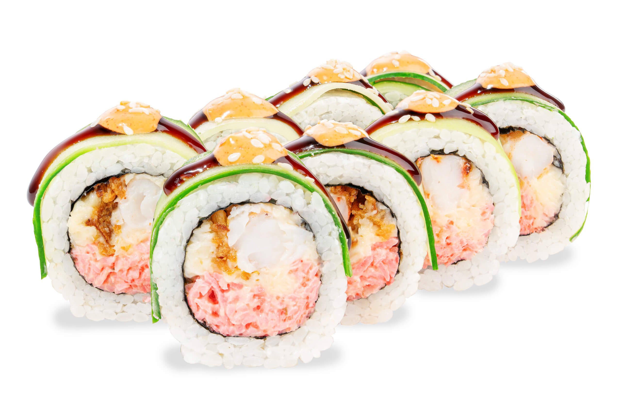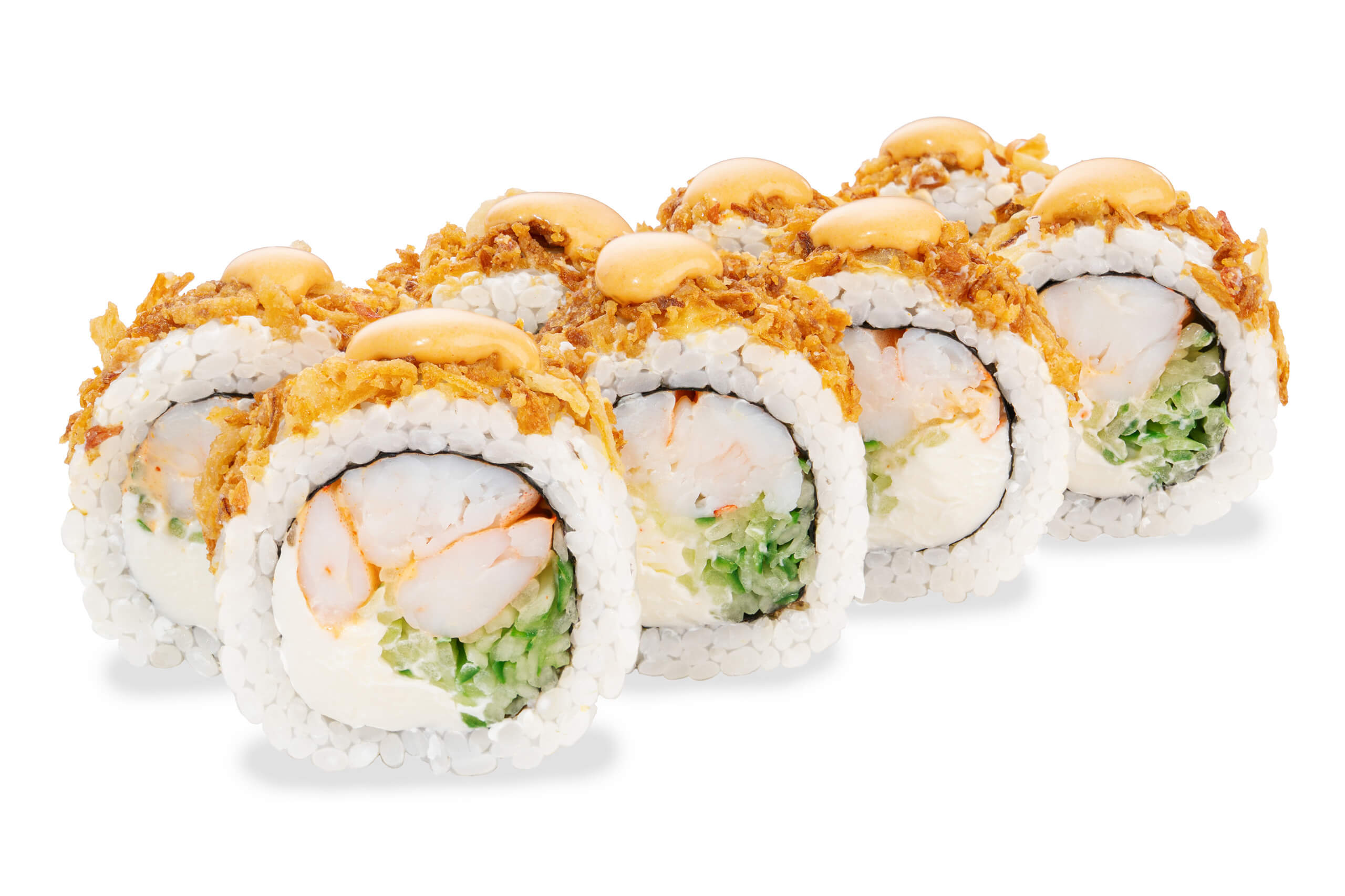 240г · Рис, нори, креветка, огурец, крабовый замес, лук фри, спайси соус, кунжут, сырно-чесночная шапка