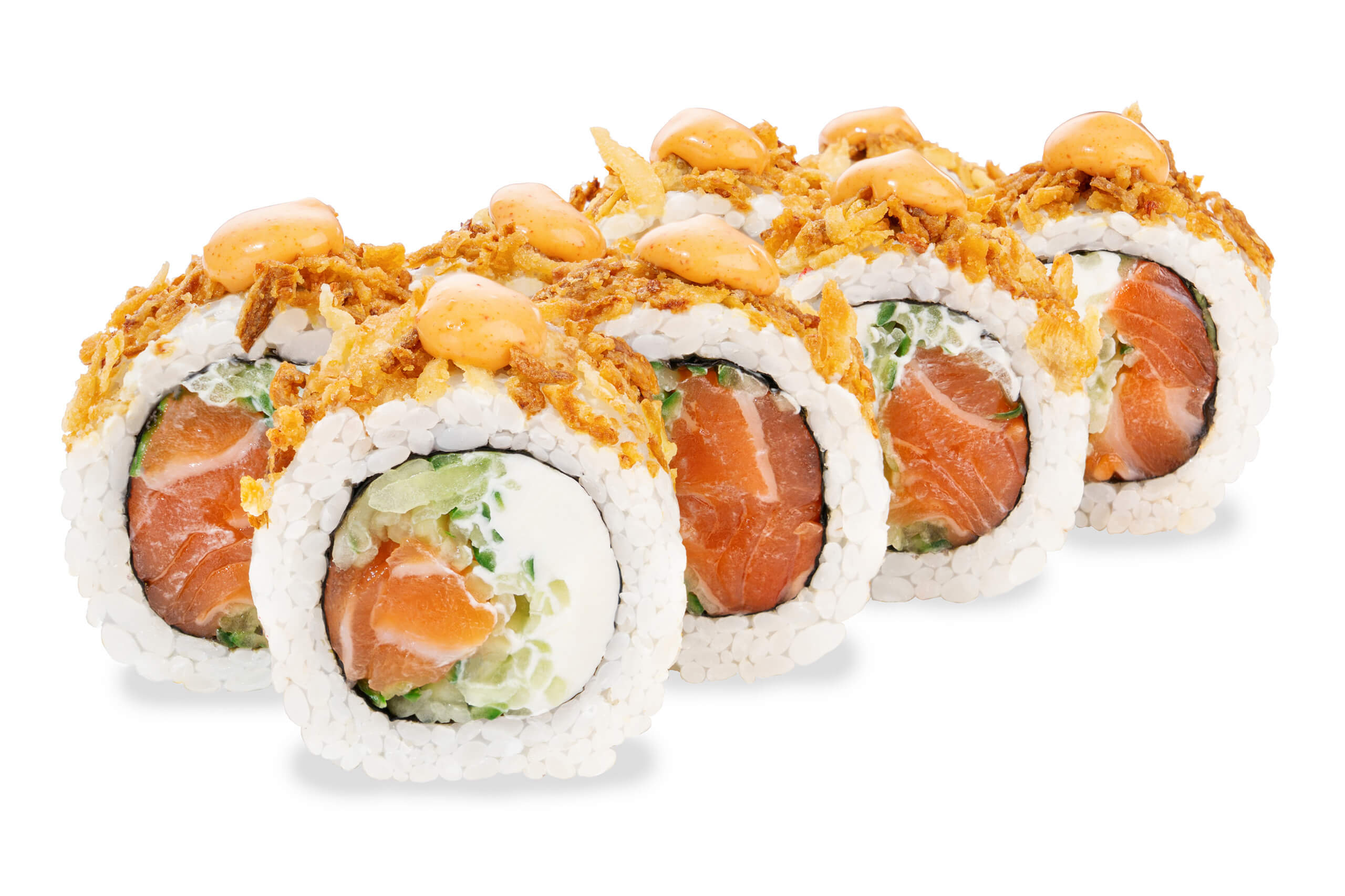 190г · Рис, нори, лосось, огурец, творожный сыр, лук фри, спайси соус