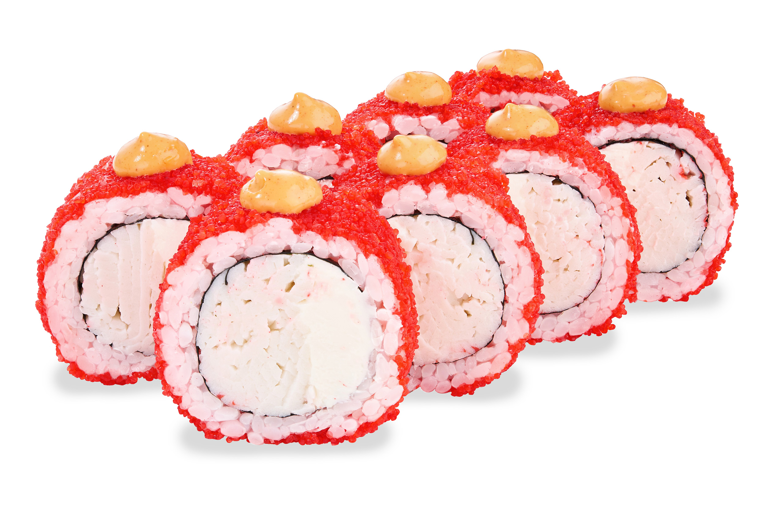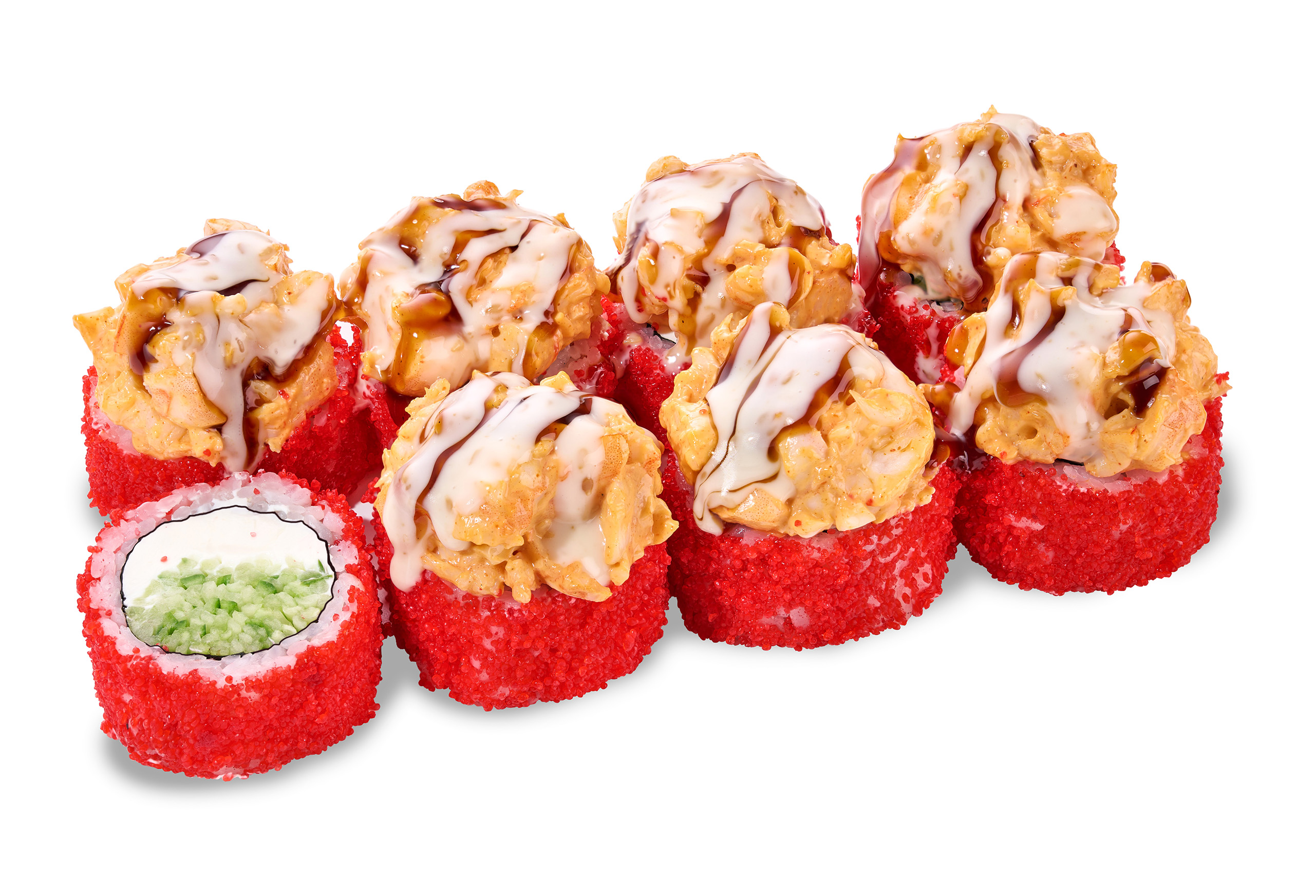 210г · Рис, нори, креветка, крабовый замес, авокадо, икра масаго, соус спайси