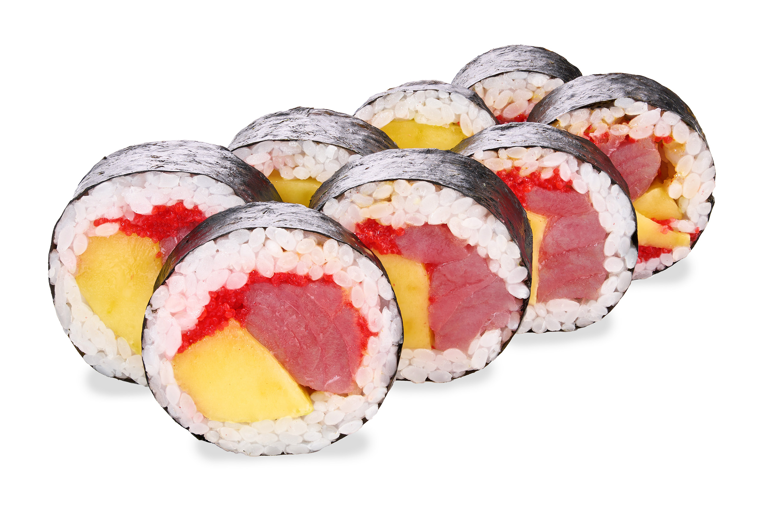 180г · Рис, нори, манго, тунец, икра масаго, спайси соус