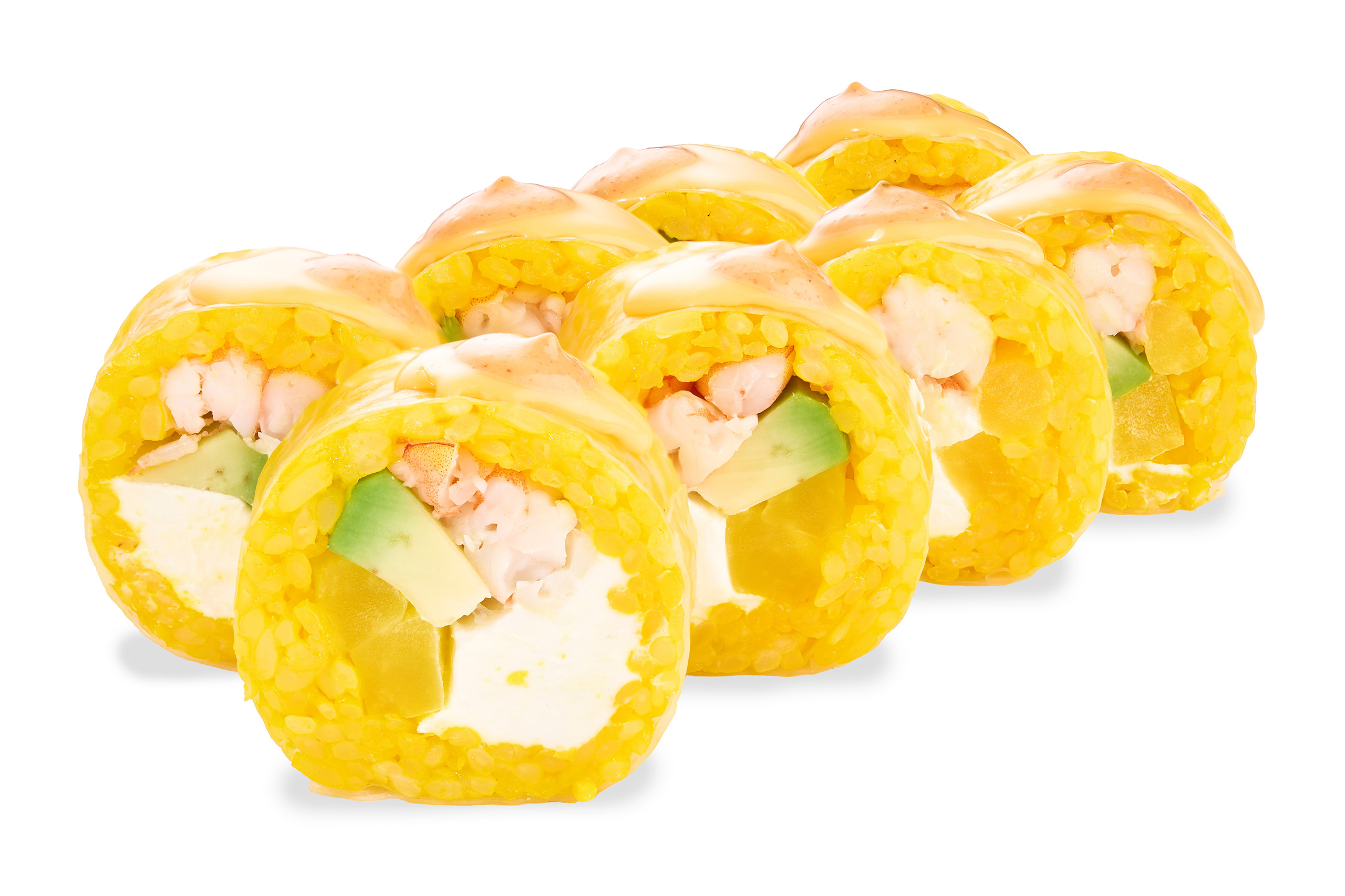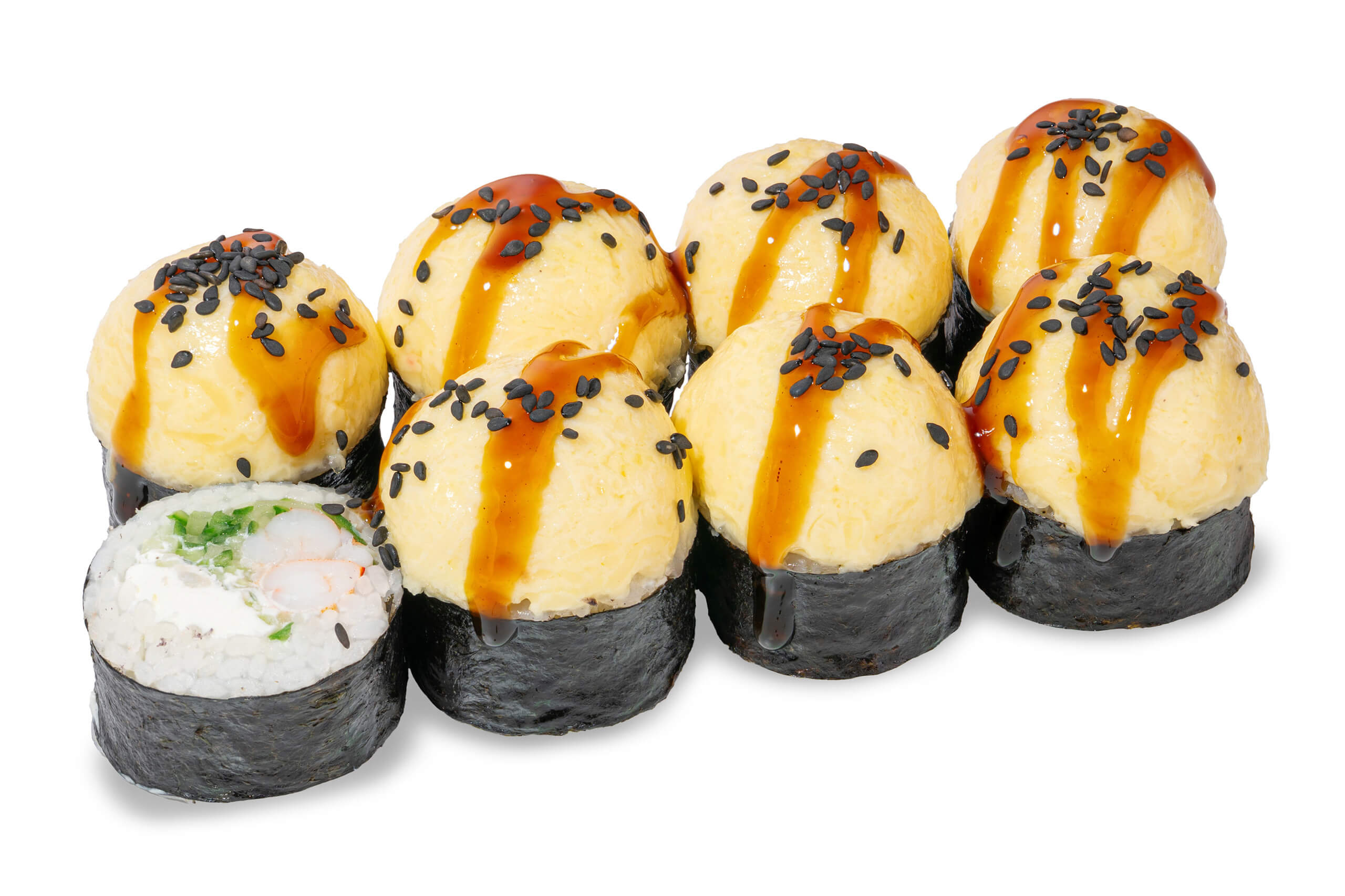 350г · Рис, нори, творожный сыр, креветка, снежный краб, авокадо, ореховый соус