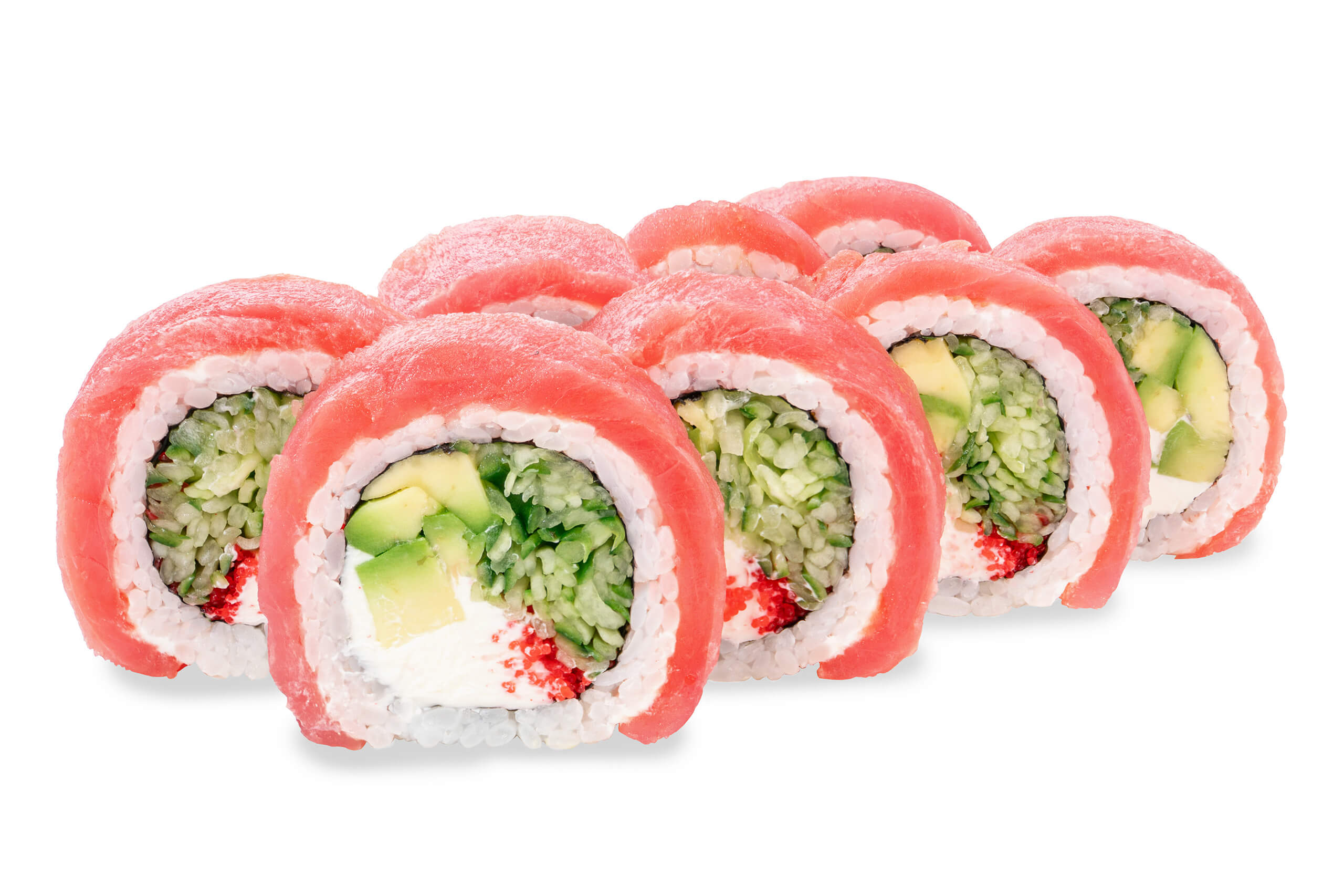 340г · Рис, нори, творожный сыр, тунец, огурец, авокадо, красная икра масаго