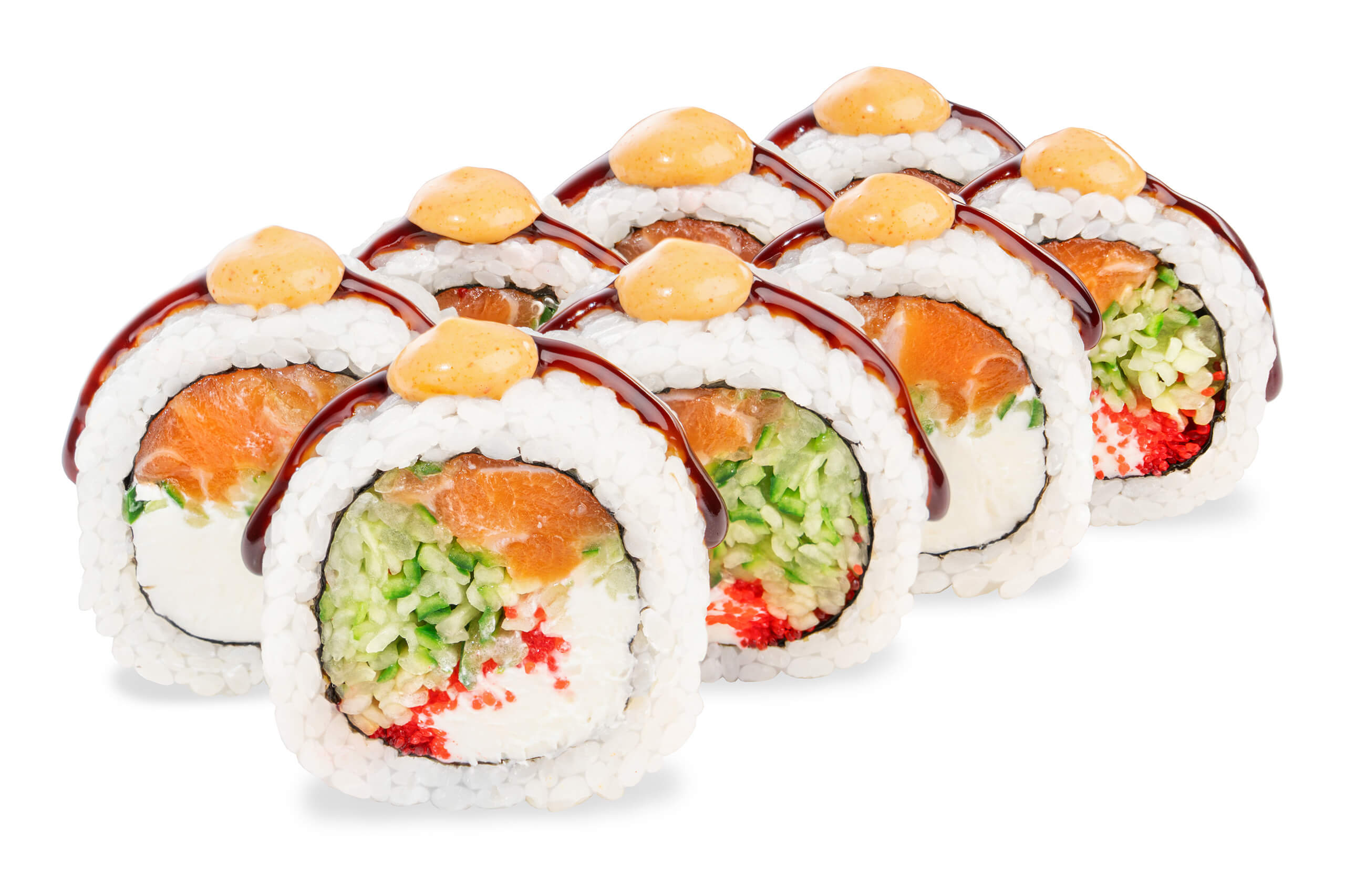 | Состав | Рис, нори, творожный сыр, огурец, лосось, красная икра масаго, унаги соус, спайси соус |